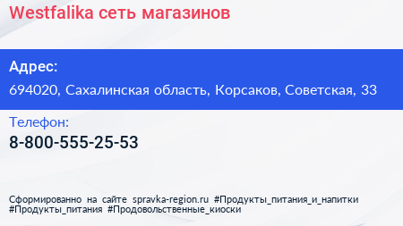 Westfalika, сеть магазинов по адресу 694020, Сахалинская область, Корсаков, Советская, 33 в дальнейшем Организация, размещена в следующих категориях: