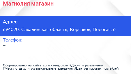 Магнолия, магазин по адресу 694020, Сахалинская область, Корсаков, Пологая, 6 в дальнейшем Организация, размещена в следующих категориях: