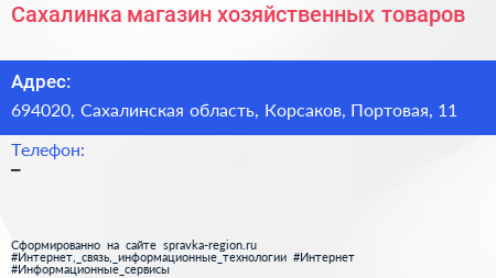 Сахалинка, магазин хозяйственных товаров по адресу 694020, Сахалинская область, Корсаков, Портовая, 11 в дальнейшем Организация, размещена в следующих категориях: