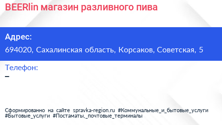 BEERlin, магазин разливного пива по адресу 694020, Сахалинская область, Корсаков, Советская, 5 в дальнейшем Организация, размещена в следующих категориях: