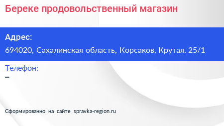 Береке, продовольственный магазин по адресу 694020, Сахалинская область, Корсаков, Крутая, 25/1 в дальнейшем Организация, размещена в следующих категориях: