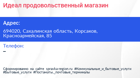 Идеал, продовольственный магазин по адресу 694020, Сахалинская область, Корсаков, Красноармейская, 85 в дальнейшем Организация, размещена в следующих категориях: