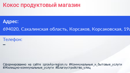 Кокос, продуктовый магазин по адресу 694020, Сахалинская область, Корсаков, Корсаковская, 19а в дальнейшем Организация, размещена в следующих категориях: