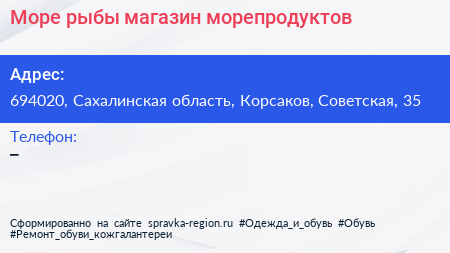 Море рыбы, магазин морепродуктов по адресу 694020, Сахалинская область, Корсаков, Советская, 35 в дальнейшем Организация, размещена в следующих категориях: