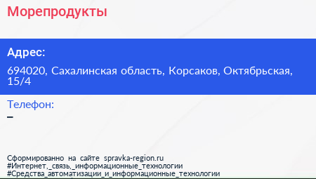 Морепродукты по адресу 694020, Сахалинская область, Корсаков, Октябрьская, 15/4 в дальнейшем Организация, размещена в следующих категориях: