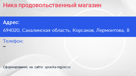 Ника, продовольственный магазин по адресу 694020, Сахалинская область, Корсаков, Лермонтова, 8 в дальнейшем Организация, размещена в следующих категориях: