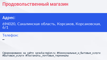 Продовольственный магазин по адресу 694020, Сахалинская область, Корсаков, Корсаковская, 6/1 в дальнейшем Организация, размещена в следующих категориях: