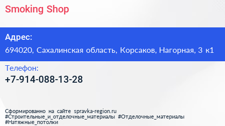 Smoking Shop по адресу 694020, Сахалинская область, Корсаков, Нагорная, 3 к1 в дальнейшем Организация, размещена в следующих категориях: