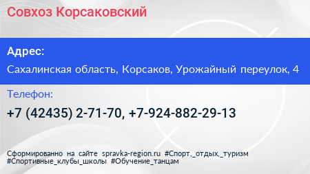 Совхоз Корсаковский по адресу Сахалинская область, Корсаков, Урожайный переулок, 4 в дальнейшем Организация, размещена в следующих категориях:
