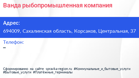 Ванда, рыбопромышленная компания по адресу 694009, Сахалинская область, Корсаков, Центральная, 37 в дальнейшем Организация, размещена в следующих категориях: