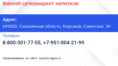 Винлаб, супермаркет напитков по адресу 694020, Сахалинская область, Корсаков, Советская, 34 в дальнейшем Организация, размещена в следующих категориях: