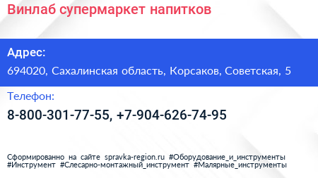 Винлаб, супермаркет напитков по адресу 694020, Сахалинская область, Корсаков, Советская, 5 в дальнейшем Организация, размещена в следующих категориях: