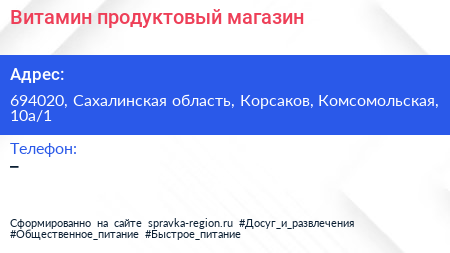 Витамин, продуктовый магазин по адресу 694020, Сахалинская область, Корсаков, Комсомольская, 10а/1 в дальнейшем Организация, размещена в следующих категориях:
