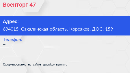 Военторг №47 по адресу 694015, Сахалинская область, Корсаков, ДОС, 159 в дальнейшем Организация, размещена в следующих категориях: