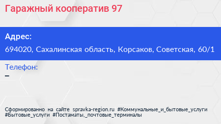 Гаражный кооператив №97 по адресу 694020, Сахалинская область, Корсаков, Советская, 60/1 в дальнейшем Организация, размещена в следующих категориях: