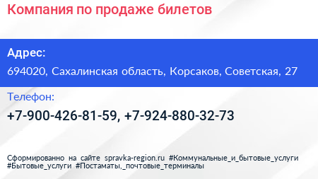 Компания по продаже билетов по адресу 694020, Сахалинская область, Корсаков, Советская, 27 в дальнейшем Организация, размещена в следующих категориях: