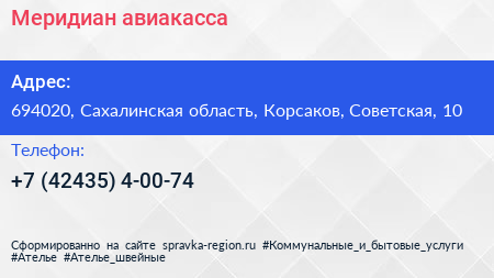 Меридиан, авиакасса по адресу 694020, Сахалинская область, Корсаков, Советская, 10 в дальнейшем Организация, размещена в следующих категориях: