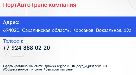 ПортАвтоТранс, компания по адресу 694020, Сахалинская область, Корсаков, Вокзальная, 19а в дальнейшем Организация, размещена в следующих категориях:
