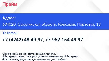 Прайм по адресу 694020, Сахалинская область, Корсаков, Портовая, 13 в дальнейшем Организация, размещена в следующих категориях: