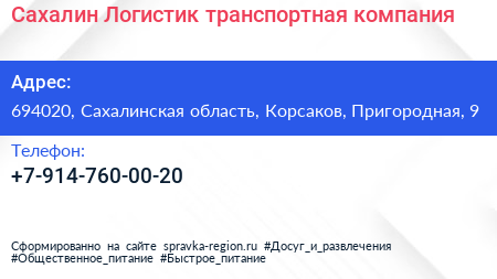 Сахалин Логистик, транспортная компания по адресу 694020, Сахалинская область, Корсаков, Пригородная, 9 в дальнейшем Организация, размещена в следующих категориях: