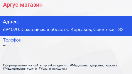 Аргус, магазин по адресу 694020, Сахалинская область, Корсаков, Советская, 32 в дальнейшем Организация, размещена в следующих категориях: