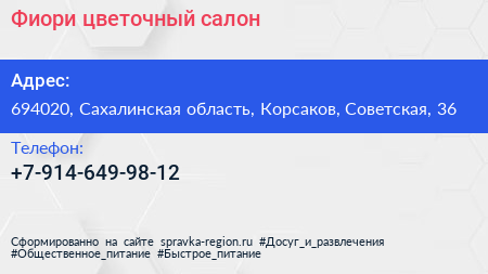 Фиори, цветочный салон по адресу 694020, Сахалинская область, Корсаков, Советская, 36 в дальнейшем Организация, размещена в следующих категориях:
