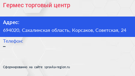 Гермес, торговый центр по адресу 694020, Сахалинская область, Корсаков, Советская, 24 в дальнейшем Организация, размещена в следующих категориях: