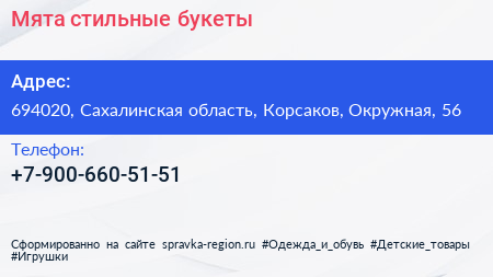 Мята-стильные букеты по адресу 694020, Сахалинская область, Корсаков, Окружная, 56 в дальнейшем Организация, размещена в следующих категориях: