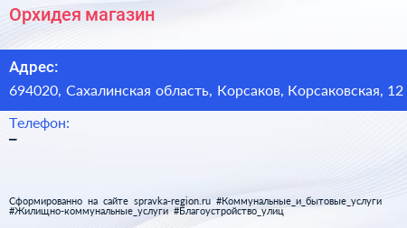 Орхидея, магазин по адресу 694020, Сахалинская область, Корсаков, Корсаковская, 12 в дальнейшем Организация, размещена в следующих категориях: