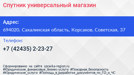 Спутник, универсальный магазин по адресу 694020, Сахалинская область, Корсаков, Советская, 37 в дальнейшем Организация, размещена в следующих категориях: