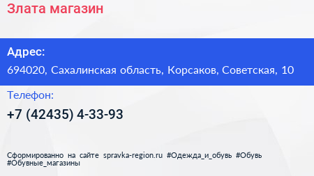 Злата, магазин по адресу 694020, Сахалинская область, Корсаков, Советская, 10 в дальнейшем Организация, размещена в следующих категориях: