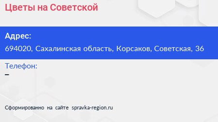Цветы на Советской по адресу 694020, Сахалинская область, Корсаков, Советская, 36 в дальнейшем Организация, размещена в следующих категориях:
