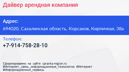 Дайвер, арендная компания по адресу 694020, Сахалинская область, Корсаков, Кирпичная, 38а в дальнейшем Организация, размещена в следующих категориях: