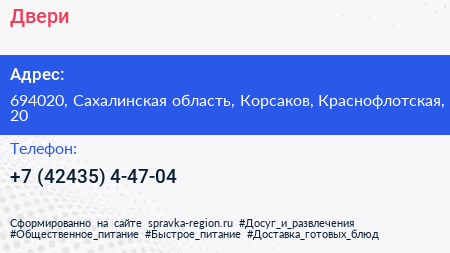 Двери+ по адресу 694020, Сахалинская область, Корсаков, Краснофлотская, 20 в дальнейшем Организация, размещена в следующих категориях: