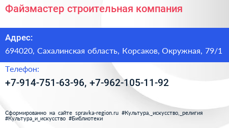 Файзмастер, строительная компания по адресу 694020, Сахалинская область, Корсаков, Окружная, 79/1 в дальнейшем Организация, размещена в следующих категориях: