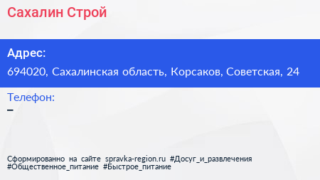 Сахалин Строй по адресу 694020, Сахалинская область, Корсаков, Советская, 24 в дальнейшем Организация, размещена в следующих категориях: