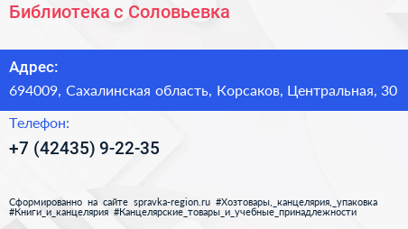 Библиотека, с. Соловьевка по адресу 694009, Сахалинская область, Корсаков, Центральная, 30 в дальнейшем Организация, размещена в следующих категориях: