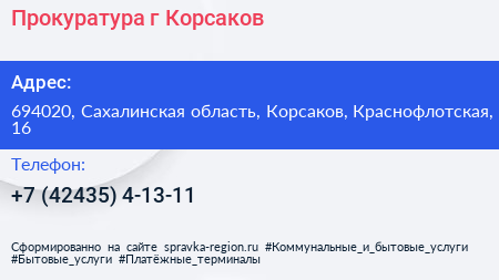 Прокуратура, г. Корсаков по адресу 694020, Сахалинская область, Корсаков, Краснофлотская, 16 в дальнейшем Организация, размещена в следующих категориях:
