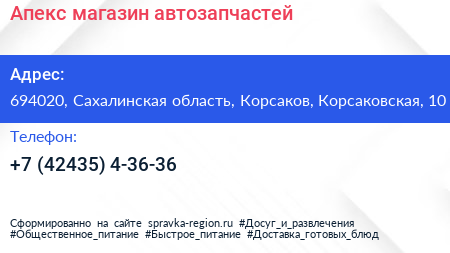 Апекс, магазин автозапчастей по адресу 694020, Сахалинская область, Корсаков, Корсаковская, 10 в дальнейшем Организация, размещена в следующих категориях: