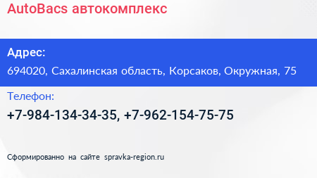 AutoBacs, автокомплекс по адресу 694020, Сахалинская область, Корсаков, Окружная, 75 в дальнейшем Организация, размещена в следующих категориях: