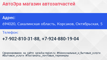 АвтоЭра, магазин автозапчастей по адресу 694020, Сахалинская область, Корсаков, Октябрьская, 5 в дальнейшем Организация, размещена в следующих категориях: