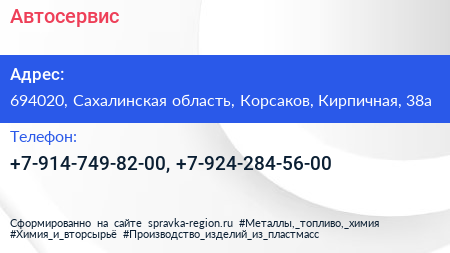 Автосервис по адресу 694020, Сахалинская область, Корсаков, Кирпичная, 38а в дальнейшем Организация, размещена в следующих категориях: