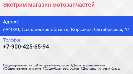 Экстрим, магазин мотозапчастей по адресу 694020, Сахалинская область, Корсаков, Октябрьская, 11 в дальнейшем Организация, размещена в следующих категориях: