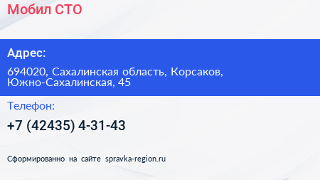 Мобил, СТО по адресу 694020, Сахалинская область, Корсаков, Южно-Сахалинская, 45 в дальнейшем Организация, размещена в следующих категориях: