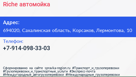 Riche, автомойка по адресу 694020, Сахалинская область, Корсаков, Лермонтова, 10 в дальнейшем Организация, размещена в следующих категориях: