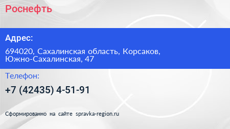 Роснефть по адресу 694020, Сахалинская область, Корсаков, Южно-Сахалинская, 47 в дальнейшем Организация, размещена в следующих категориях: