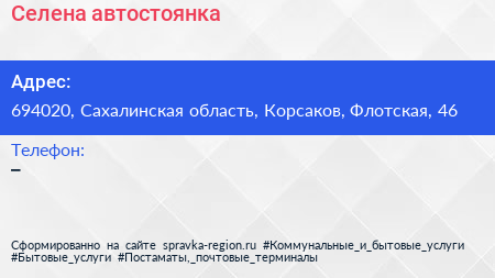Селена, автостоянка по адресу 694020, Сахалинская область, Корсаков, Флотская, 46 в дальнейшем Организация, размещена в следующих категориях: