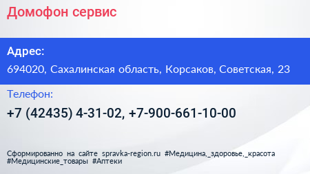 Домофон-сервис по адресу 694020, Сахалинская область, Корсаков, Советская, 23 в дальнейшем Организация, размещена в следующих категориях: