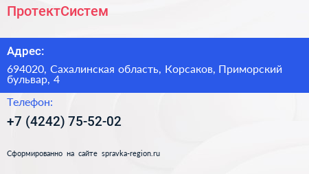 ПротектСистем по адресу 694020, Сахалинская область, Корсаков, Приморский бульвар, 4 в дальнейшем Организация, размещена в следующих категориях: