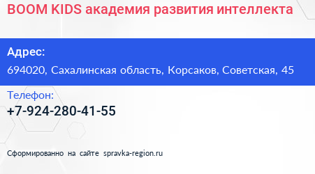 BOOM KIDS, академия развития интеллекта по адресу 694020, Сахалинская область, Корсаков, Советская, 45 в дальнейшем Организация, размещена в следующих категориях: